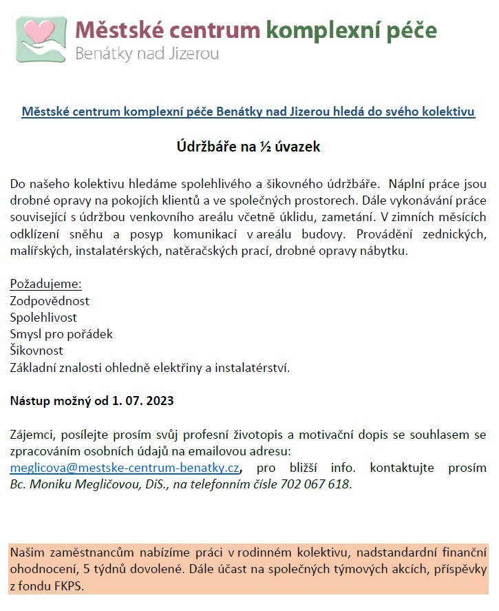 Městské centrum komplexní péče Benátky nad Jizerou hledá do svého kolektivu nového kolegu na pozici: Údržbář na ½ úvazek
